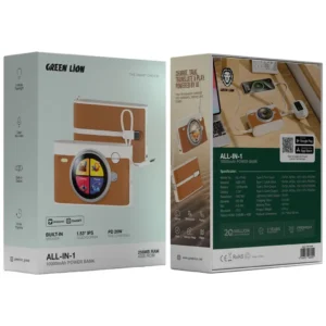 The Green Lion All-in-One 10000mAh Power Bank stands for power and versatility wrapped up in a sleek and durable body. The ABS + PC-made device carries a 10000mAh capacity battery, the 1.53-inch IPS touchscreen of 360×360 resolution being its control screen. It contains a speaker rated at 4Ω, 3W, and a 4.5mm microphone for audio calls and media applications. Bluetooth V5.3 rests upon convenient usage, safeguarding uninterrupted connections. The 256MB RAM and 4GB ROM combination opens the world of apps, games, translation, maps, and Qibla for a multifunctional experience. On the power bank, PD 20W fast charging is offered along with multiple outputs through Type-C and Lightning cables, while there is a charging time of about 2.5 hours and a working time of about 10 hours. Whether for working, playing, or gallivanting, Green Lion All-in-One Power Bank remains the ultimate on-the-go solution.