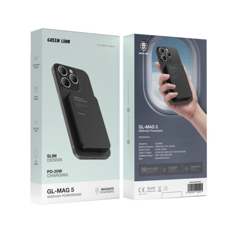 Green Lion GL-MAG 5 5000mAh Power bank will operate efficiently while saving space. With a 5000mAh battery capacity, it gives reliable power while you travel. Distic from 20W Type-C output fast charging and 5W-15W wireless output, it supports versatile charging options. Strong magnetic alignment ensures that it attaches to your devices for easy wireless charging. It has an LED indicator that will tell you the battery status and a slim body allows easy carrying with pocket accommodation. Well, one thing: USB-C output and wireless charging will keep your Green Lion GL-MAG 5-5000 Battery power bank working with power support throughout the day.