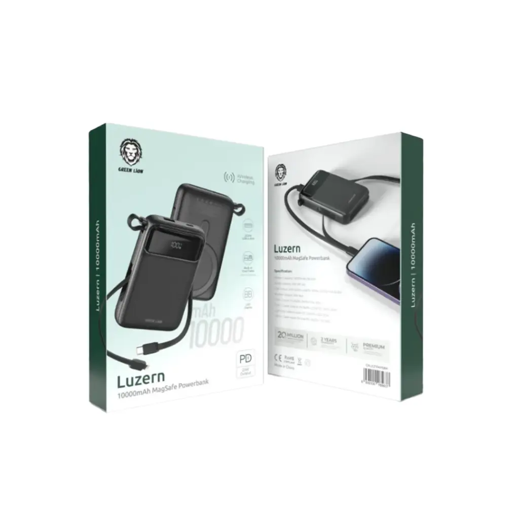 The Green Lion Luzern is a 10000mAh MagSafe Power Bank-small yet powerful for charging needs. Its battery capacity of 10000mAh/38.5Wh offers a fast charging experience and many powerful output formats, including PD 20W output, a 22.5W USB-A port, and wireless charging of up to 15W. The dual built-in cable of USB-C & Lightning offers a lot of convenience, thus enabling fast charging on the go. Both input/output Type-C ports give 18W fast charging. Its stunning looks and stellar performance make it a perfect day-to-day and travel power bank to keep your devices live on the go.