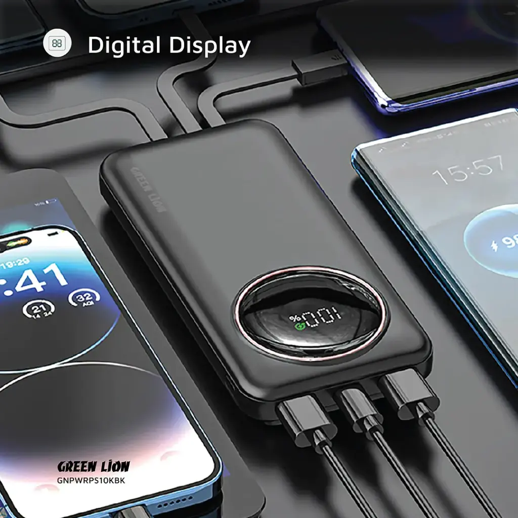 Feel powered on the go with the Green Lion Power Pulse 20000mAh Power Bank, a versatile, high-performance charging solution. Constructed from durable ABS + PC materials, this power bank mixes reliability with style. With an enormous 20000mAh battery capacity, it offers endless power to your devices. It has multiple input options: a Type-C port supporting 22.5W and recharging via a USB-A cable for fast and easy recharging. Besides providing outputs, it comes with 2 USB-A ports, a Type-C port, and integrated Lightning, USB-Micro, and Type-C cables. It supplies up to 22.5 W fast charging for a wide variety of devices. The digital display shows the condition of the battery, while built-in cables make it more portable, given that additional accessories are less necessary. Be it your smartphone, tablet, or any other gadget, Green Lion Power Pulse Power Bank offers great efficiency and fast charging, hence being highly indispensable in daily usage and even during journeys.